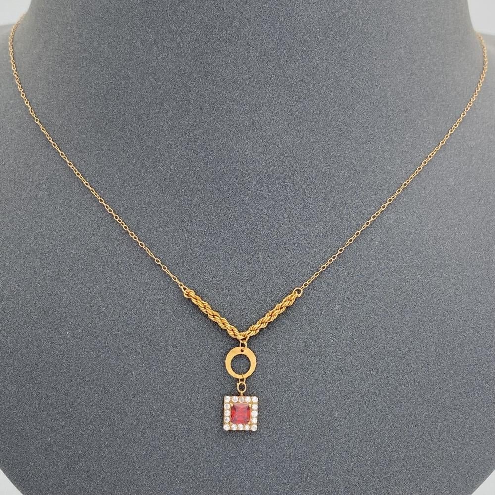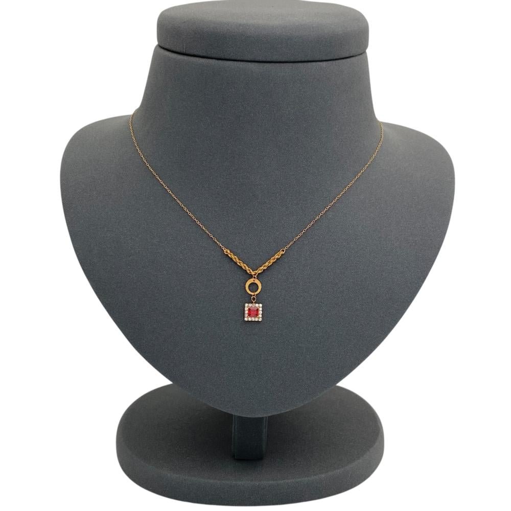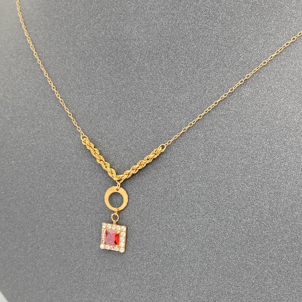 مواصفات عقد ذهب مربع بحجر أحمر عيار 21 وزن 1.26 جم تصميم أنيق يمنحك حضورًا فريدًا لا يُنسى